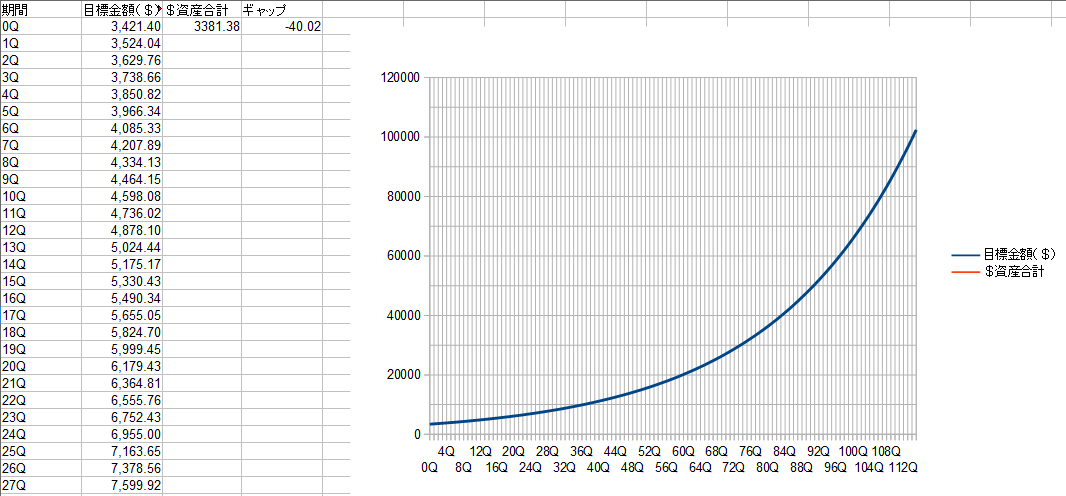 ざっくり10万ドルを目標に、この増加率の通り資産を増やせたとして、どれだけの期間運用したらいいかを参照してみたのですが