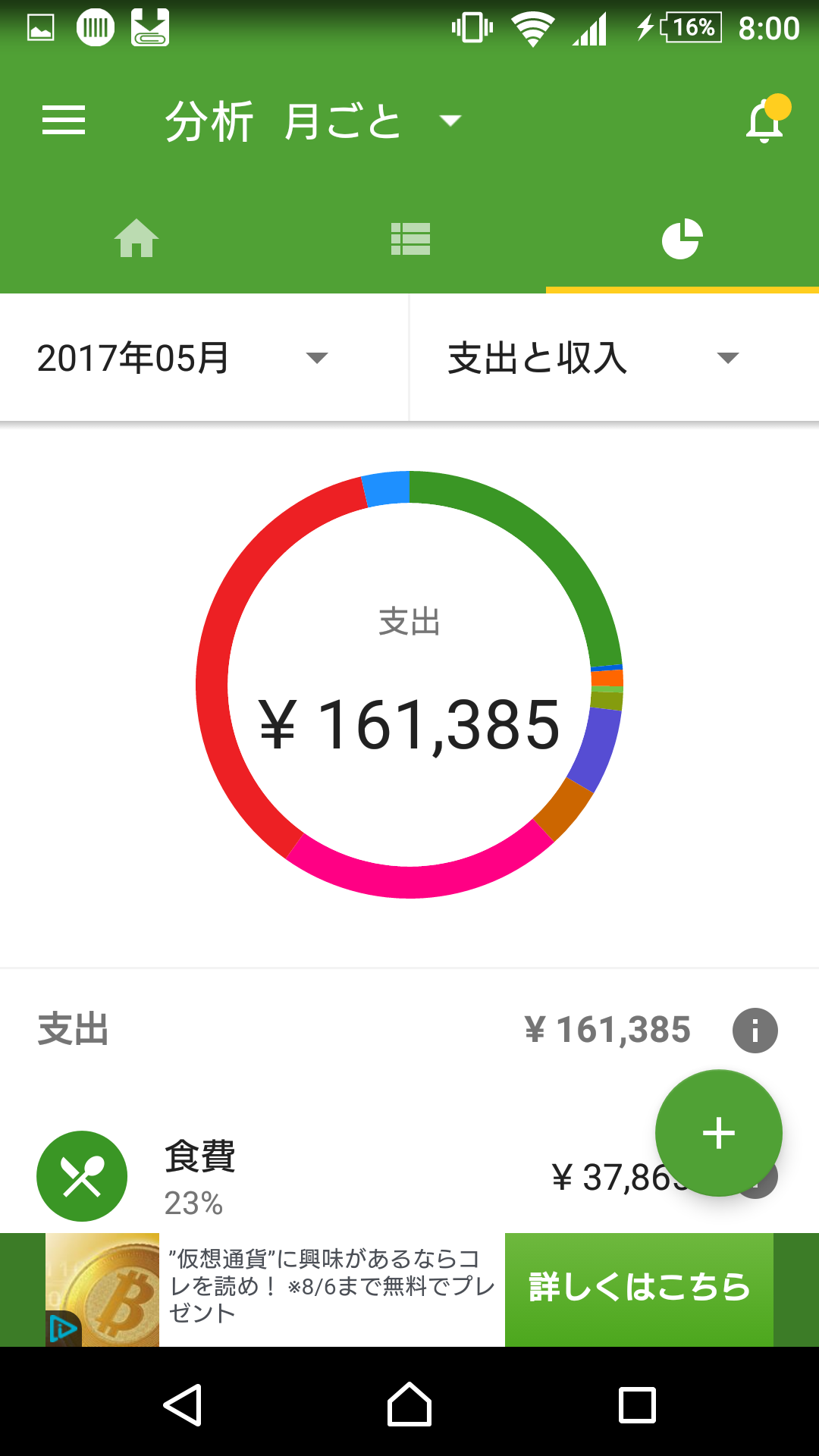 5月は161,385円、予算オーバーが続くな、、、この月は車の任意保険の支払いがあったので仕方ないといえば仕方ないが。ドラッグストアに立ち寄った際に、駐車場に車停めて車のドアを開けたら隣の車にもろドアが接触して傷付けてしまい・保険適用で向こう3年間は≒1万の保険料支払負担増となってます。