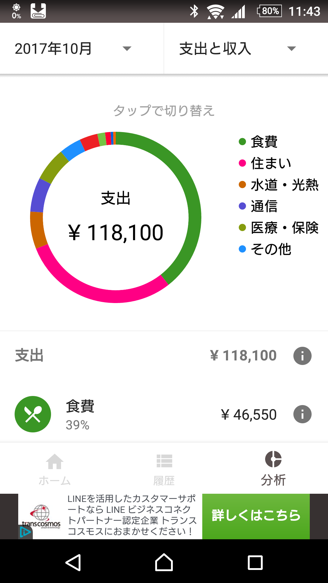 アプリ上の合計は46,550円なので僅かながら誤差が出てますが、追求するほどの事でもないと判断して飲食費意外の項目の振り返りに移ろうと思います。