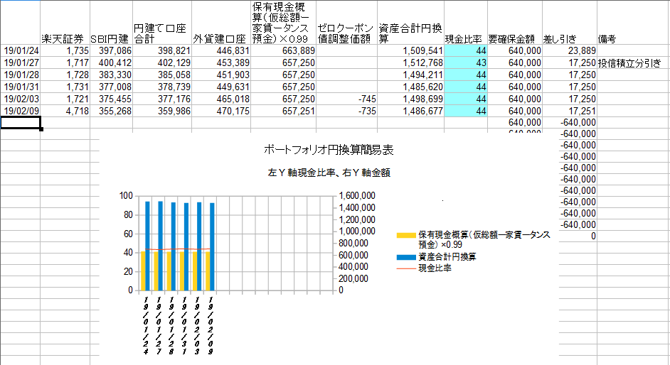 現金額は種銭仮総額から当月家賃とタンス預金分を引いて、更に投資信託積立予定分(概算で残額の1%)を引いたものです、円建て口座の投資判定時後に原則月1回の更新とします。