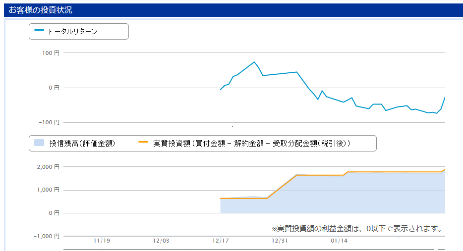 ベアファンドのトータルリターンと評価額の推移です(楽天証券はこういう個別ファンドごとの推移がグラフ化されるのがとてもいいですね!)