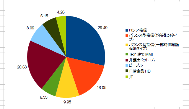 現在投資信託3本、外貨建てMMF1本、単元未満株4銘柄に資金を分散投資して、資金投下総額約11万に対して△8%程の含み損となっております、、、