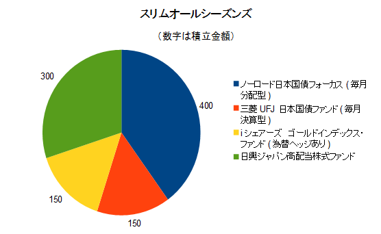 で、私もスリムオールシーズンズだから!という事で、深い意味もなく商品(コモディティ)のクラスを排除して、債券は国内オンリー、株式も国内(インデックスではないのですが)という保守的かつ為替の影響がダイレクトには来ないポートフォリオを組んでみました。