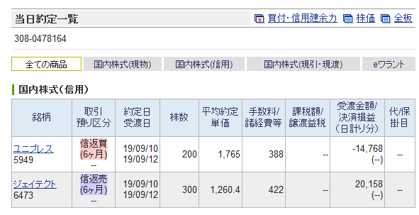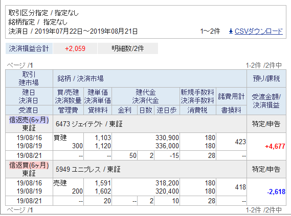 といささかガックリ来ていたのですが、信用決済明細(現物株の譲渡損益みたいな感じ、建てたポジションを決済した際の実質の損益が表示される)を確認してみたら