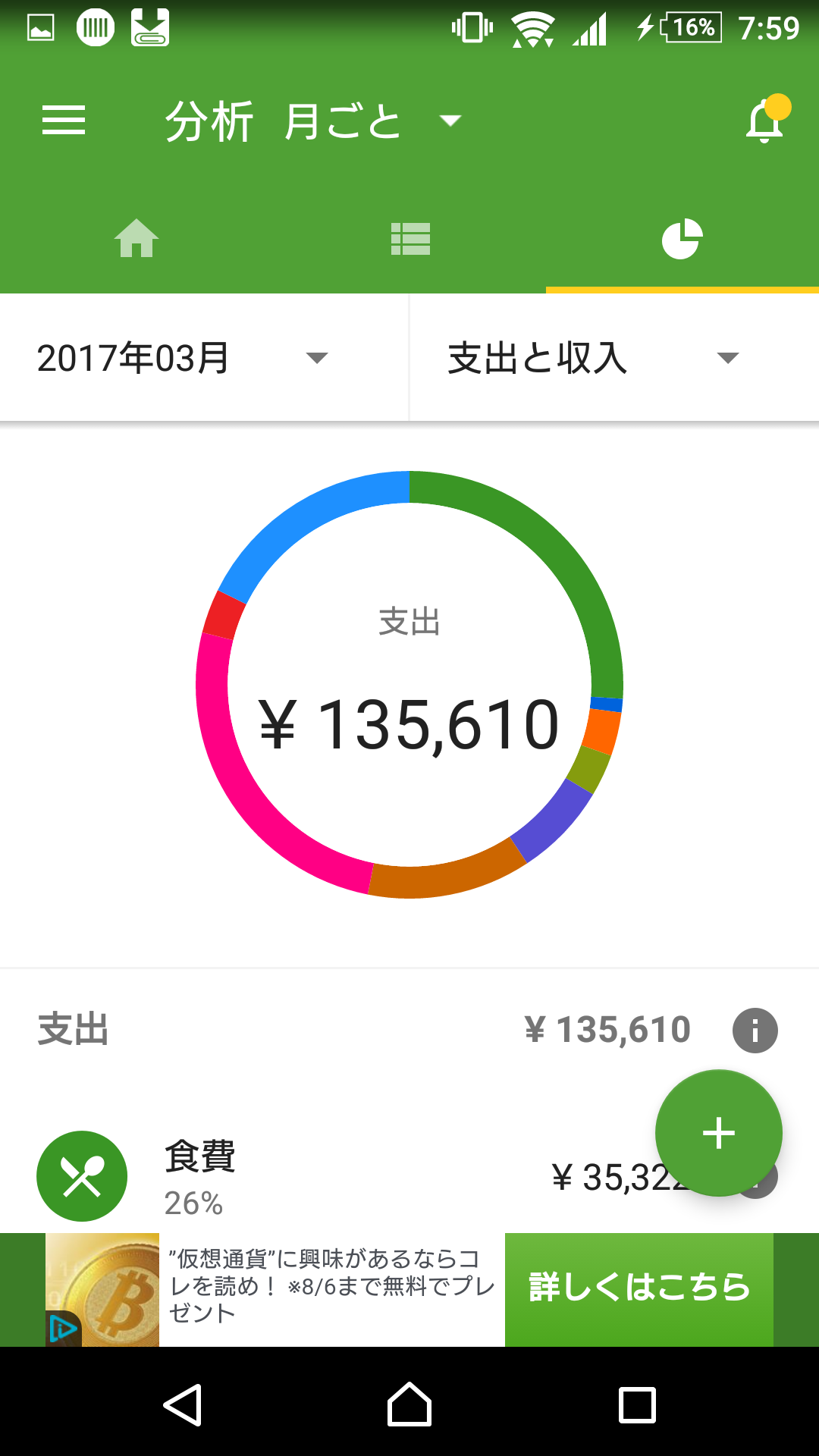 次に気になる支出がネット、携帯合わせた通信費≒1万3千。これは4月に来た引き落としの明細内訳で分かったんですが移行した格安SIM(OCNモバイルONE)に頼んでもないのになんだかんだオプションがついてて料金がかさばっていましたorz 今月(2017年4月)に手を打ったのでこの費用の膨らみが収まるのは6月からです。