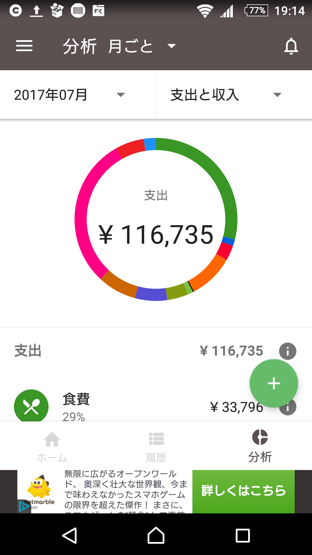 後エンタメ関係の出費が9%の支出割合で10,462円の支出金額(カラオケ3回で2,959円・huluの引き落とし用に1,000円、映画を2回観て2000円・フィギュアを4体買って4,503円)ストレス解消だとか余暇を楽しむとかも凄く大事ですが、結果予算オーバーという事態を鑑みるにもうちょっとお金をかけずにやり過ごせた方が良かったかなという気がします。