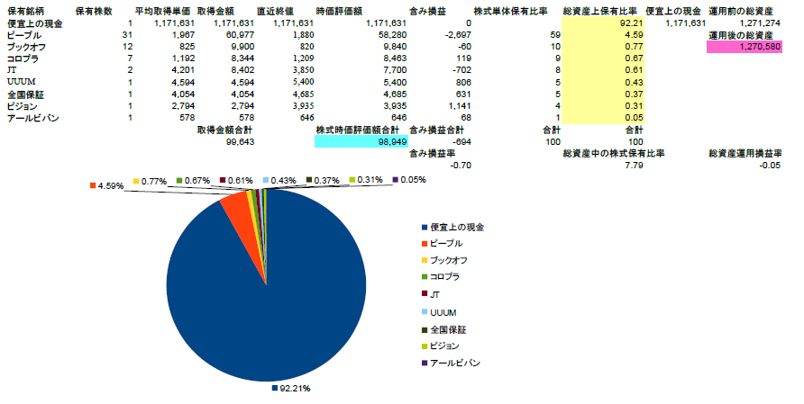 みたいな感じで保有銘柄名、保有株数、評価金額、運用損益、現金も含めた資産全体の中での保有比率を開示したいと思います。