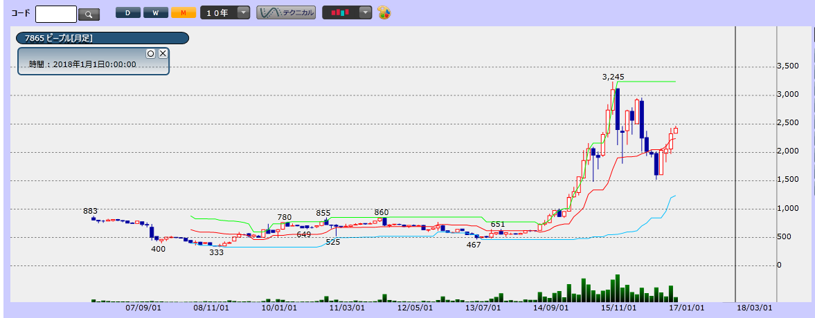 HLバンド付きで保有主力株のピープルを表示してみました、このチャートをうpしたのは「配当性向100%の企業の株価が大きく続伸することがあるのか?」という疑問からでした。(いつからそうなのかはわかりませんが、7865:ピープルは現在配当性向100%です)