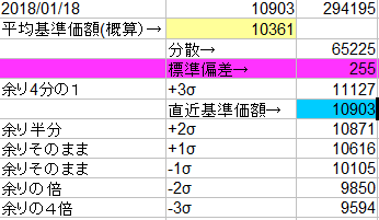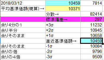 ↑ 先週末計算した楽天全米株式インデックスファンドの売買参考表です、19日付けの基準価額のデータはDL出来なかったので18日までの基準価額で標準偏差を求めています。