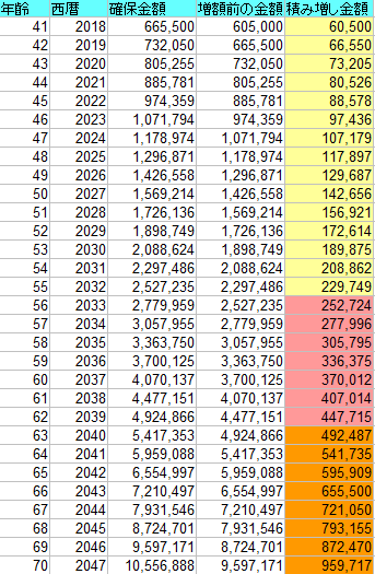 そしてラスト8年間(62歳~70歳)確保金額の積み増しが初っ端から≒50万で最終的には≒100万の積み増しというおいおいどうすんだ?的なペースになっています。