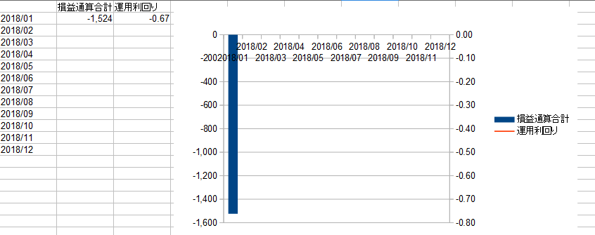 グラフ右側のY軸が運用利回りです、こちらは折れ線グラフで表示されるようにしているのですが2個以上値を入力しないと折れ線が出現しないようなので運用利回りの折れ線グラフ表示は2月頭になると思います(ちなみに今回の値は△0.67%です)