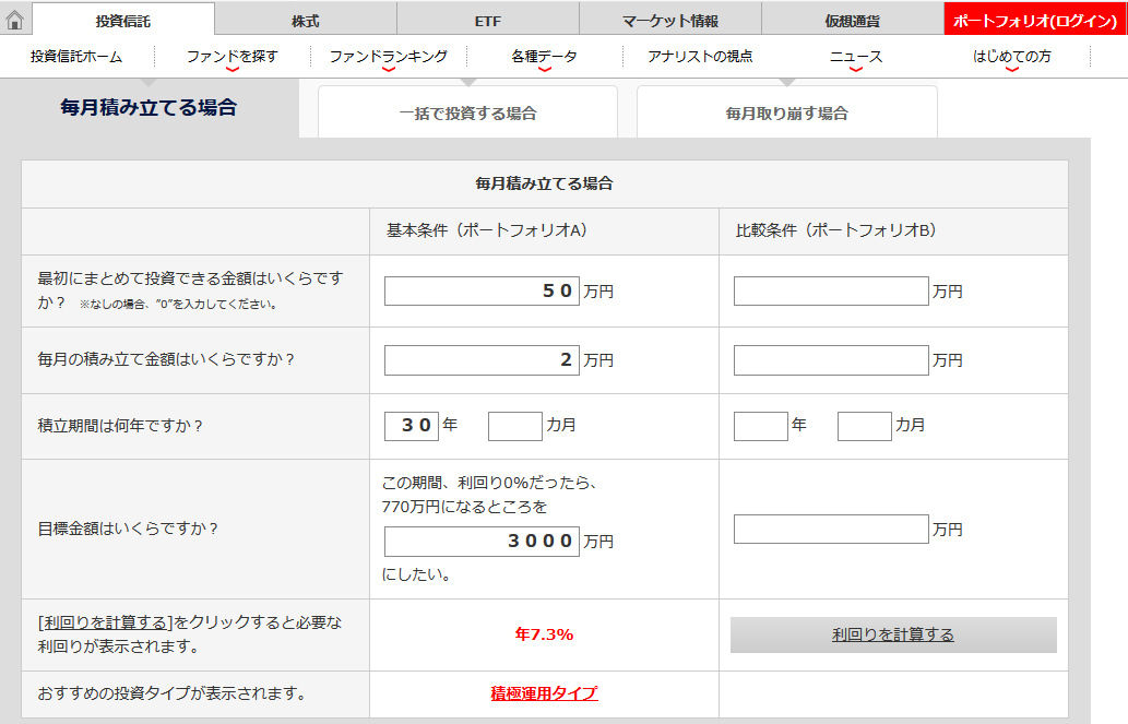初回50万投資、以後毎月2万を追加投資で30年orz(30年後だと、70代なんですけど)、かつ年7.3%の成長が実現されてようやく3,000万円という金額に届きます、、、