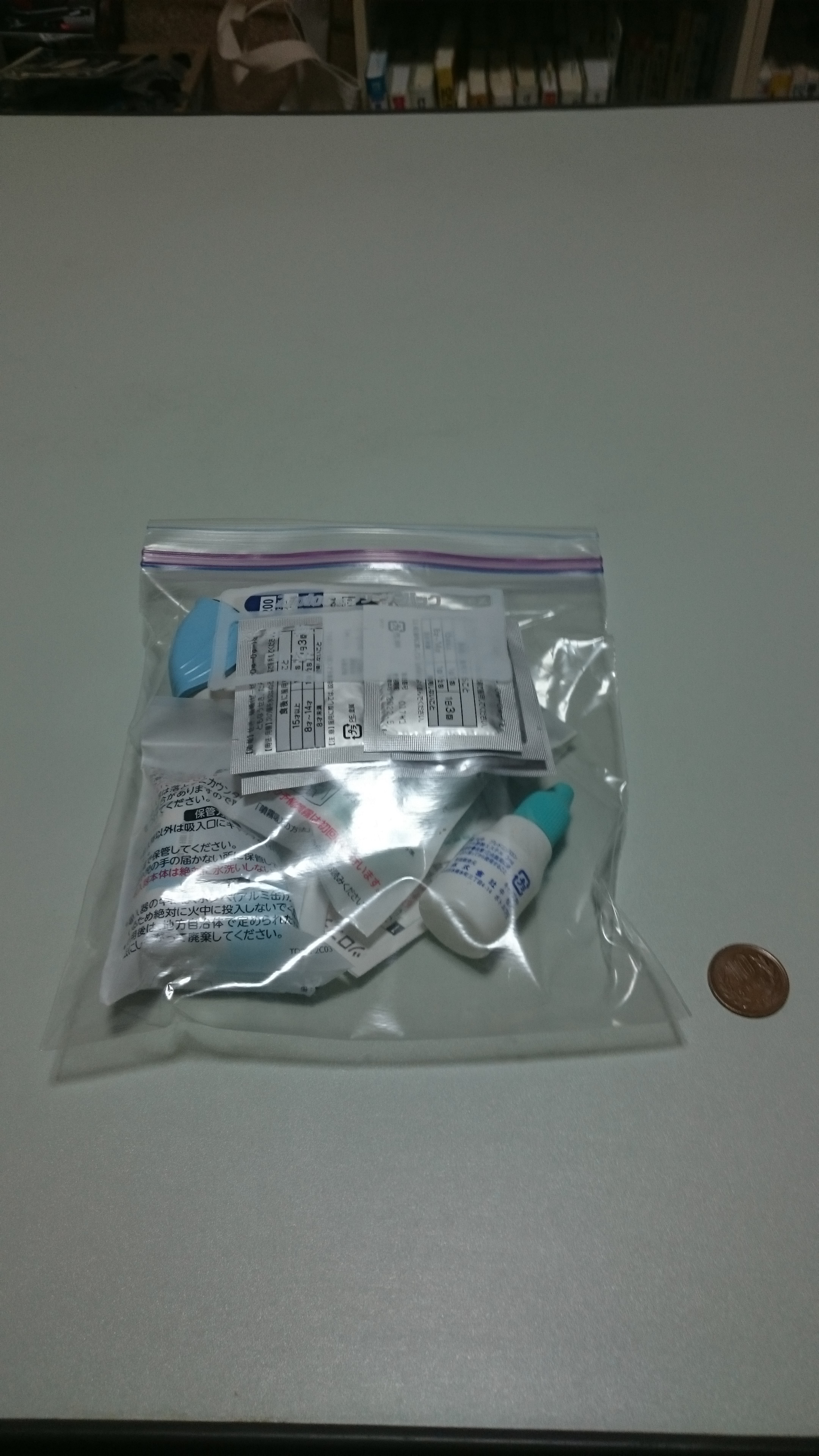 ※画像はクリックで拡大出来ます、幅18センチ・高さ22センチ程度のごく小さ目なジップロックです、一応大きさ比べ出来るように10円玉置いてみました。