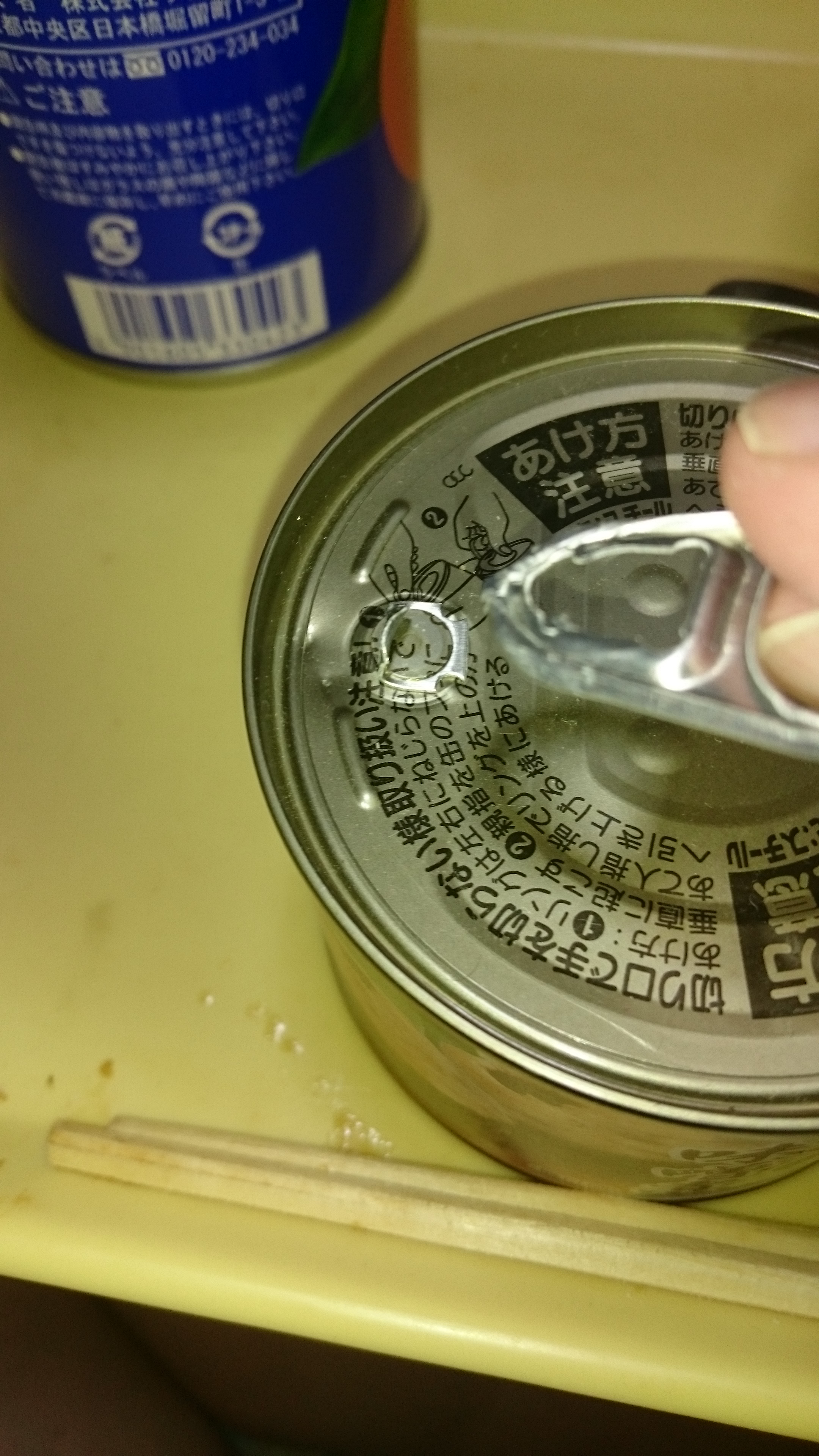 プルタブで開けるタイプの缶詰を開けようとしたら、プルタブの部分だけペキッと取れて(怒)となった状態です。