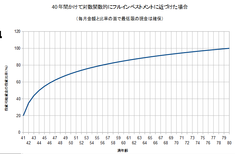 ちなみにY軸は投資可能資金の何%を投資に振り向けるかですが、横軸は私の年齢になってます。なぜ41歳がスタートなのかというと、単に私が満41歳で今からがスタートと捉えているからです。