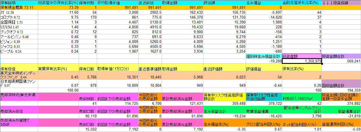 総資産額は生活費に充当するタンス預金除いて、1,350,979円です。